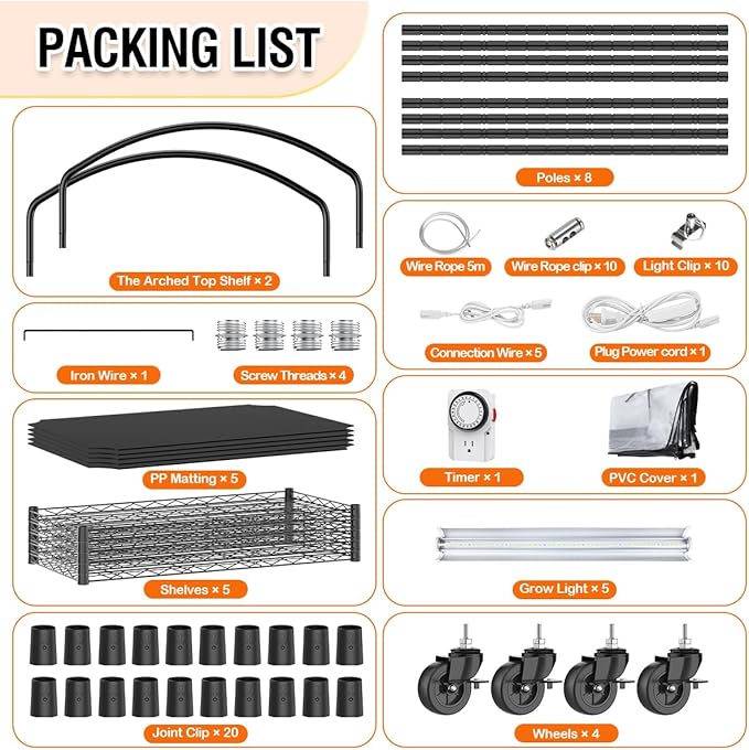 - All-in-One Indoor Greenhouse Kit with Lights: Measuring 29.5 x 13.7 x 71 inches, this mini greenhouse indoor includes a 5 tier greenhouse stand, durable PVC cover, 5 full-spectrum grow lights, shelf liners, and rolling wheels. Designed to be compact yet spacious, it creates an ideal growing environment for year-round gardening indoors