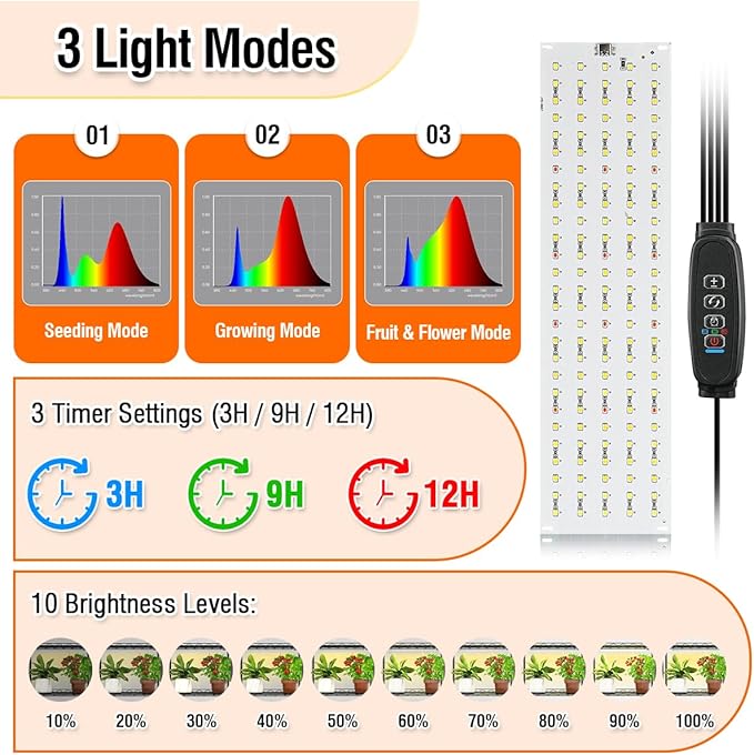 - Full-Spectrum Grow Light with Smart Timer Control: Equipped with 32W full-spectrum LED grow lights, this plant shelf with grow light replicates natural sunlight for healthier growth. Features include 3 lighting modes, 3 timer settings (3/9/12 hrs), and 10 brightness levels. Ideal for every plant stage, from seedlings to flowering