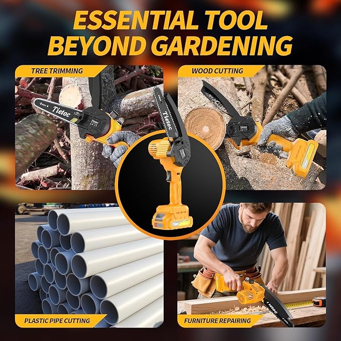 - [Lightweight electric chainsaw - female friendly]:Lightweight, Comfort yet Strong - Tietoc 6 inch mini chainsaw is light and portable (only 3.3lb/1.5kg). Its ergonomic design reduces operational fatigue and enhances grip comfort, which allows elders or women to easily trim garden branches. We are striving to make it a thoughtful gift for both men and women, husbands and wives, houseowners and gardeners.
