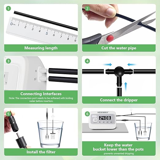 - Smart Installation & Safety Notes:For best results, always place the water source lower than your pots. If the bucket is positioned higher, it may cause a siphon effect, leading to continuous dripping even when the pump is off. Also note: Do not place pots higher than 1.5m (4.9ft) above the device, as insufficient water pressure may prevent proper flow to the drippers. Following these setup rules ensures stable and reliable watering for every plant