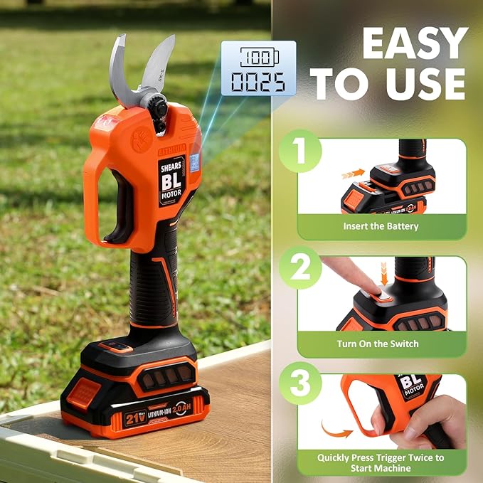 - 【Smart LCD Display】Cordless pruning shears are equipped with a built-in LCD display that shows real-time battery level and cut count, helping you stay informed of usage and manage tasks efficiently. The auto-sleep mode activates after 1 minute of inactivity, effectively reducing accidental starts and giving you full control over the workflow while minimizing risks