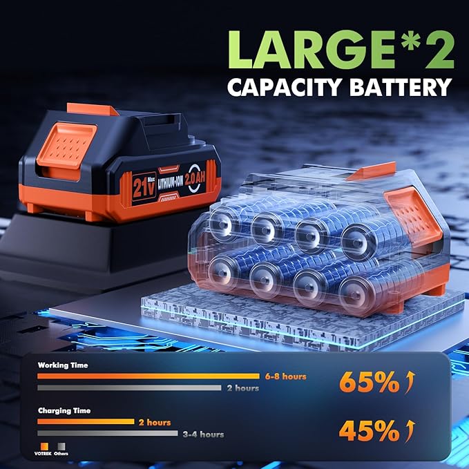 - 【Long-Lasting Power】The electric pruner is equipped with 2 * 2000mAh high-capacity lithium batteries, offering a fast 1–2 hour charge time and up to 6–8 hours of runtime. The dual battery system allows for seamless switching, ensuring uninterrupted operation and making it easy to tackle large pruning jobs