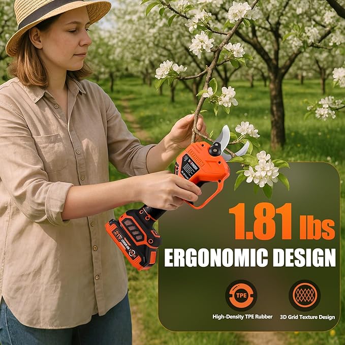 - 【Arthritis-Friendly Comfort】Featuring an ergonomic, non-slip grip and a lightweight design (just 1.81 lbs), these battery pruning shears reduce hand fatigue and are easy to handle. Perfect for senior and women, the design ensures comfortable, long-term use without strain, making yard work more enjoyable and accessible for all