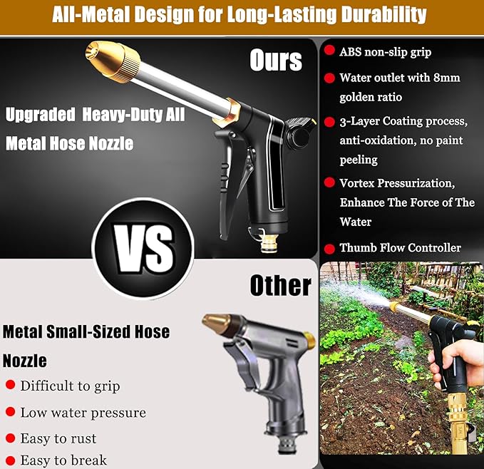- 【UPGRADED HIGH PRESSURE HOSE NOZZLE】The spray nozzles for garden hose is made of Thickened And Lengthened Stainless Steel Pipe and features a spiral Pressure Boosting Design.The ABS Non-Slip Handle adopts ergonomic design to enhance comfort.The rubber layer ensures protection against the flow temperature of hot or cold water.The water hose nozzle also includes a labor-saving lock, which will not make you feel tired even after prolonged use.