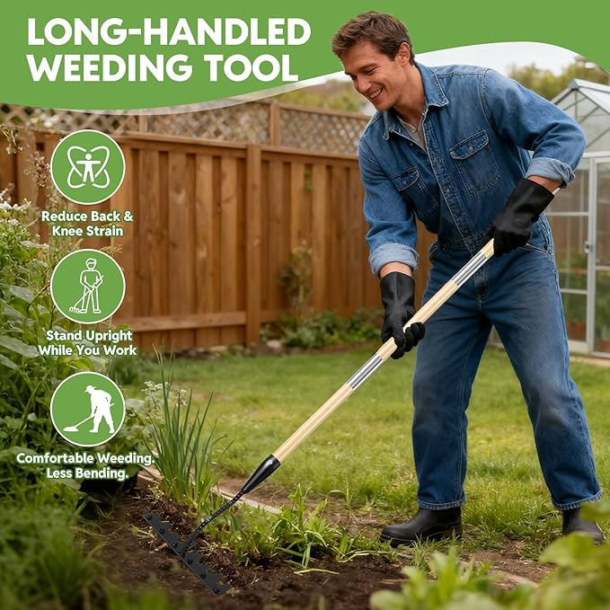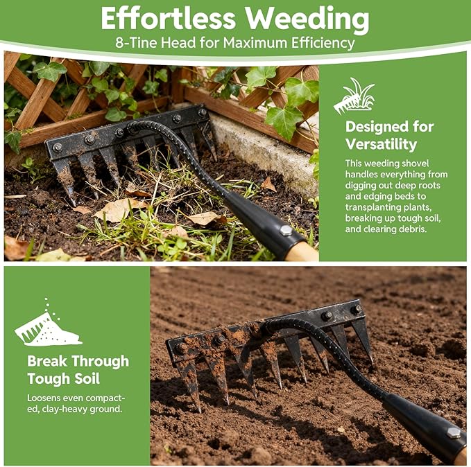 - 【Razor-Sharp Blade & Tines】Equipped with an ultra-sharp blade for slicing through weeds and 8 hardened steel tines that penetrate easily into hard or dry soil, removing deep-rooted weeds effortlessly. Built with commercial-grade quality, this weed puller tool performs year-round on farms, gardens, and large lawns—especially for dry, hard soils and spacious backyards.