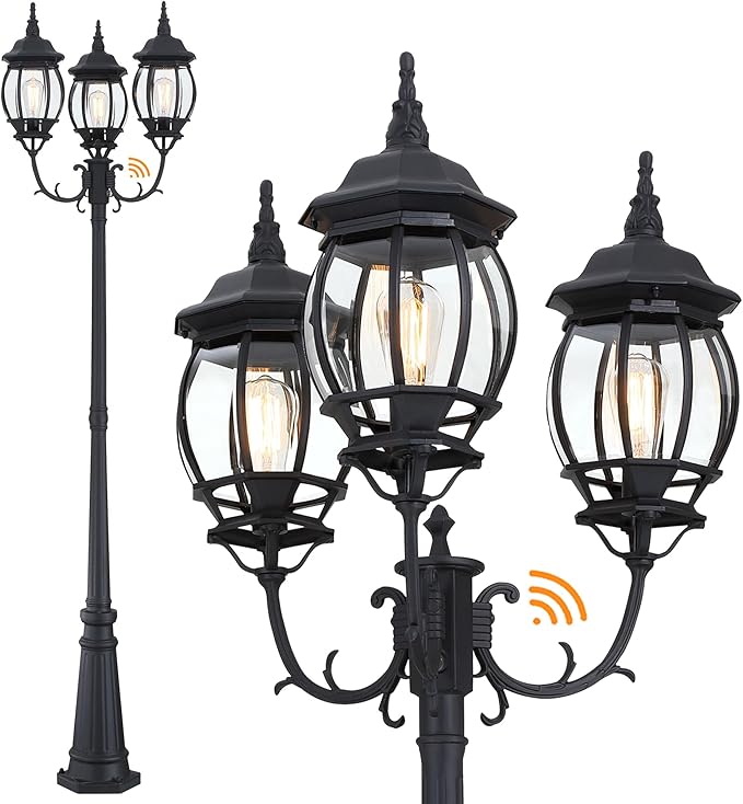 - This 94” dusk to dawn lamp post light with three head offers exceptional versatility for various settings. The large photocell lamp post light integrates perfectly in residential areas like front yard,driveway,backyard,deck,patio,lounge or garden paths. The large photocell post lantern also suitable for many commercial or public applications, such as roundabouts at hotel entrances,pedestrian shopping districts or as guiding lights along long driveways.