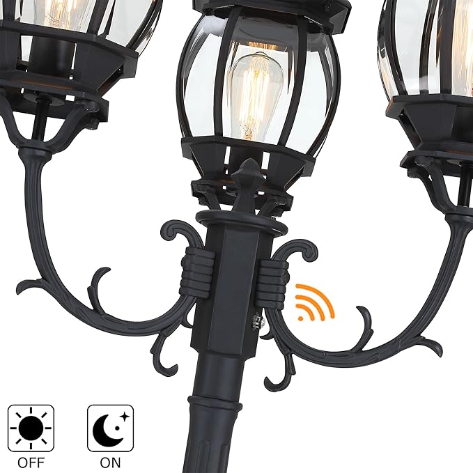 - This 94 inch triple-head post lantern dusk to dawn combines vintage 1900s style with modern craftsmanship. Features clear glass shades for warm illumination and hollow-carved lantern bases that adds a layer of visual interest and create enchanting patterns when lit. Constructed from high-quality aluminum alloy with a fine powder-coated finish, the 94inch 3-light post lantern with dusk to dawn sensor offers exceptional texture and enhanced durability.