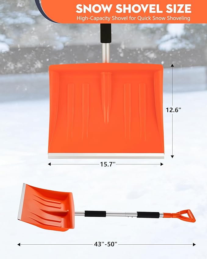 - Sturdy and Durable -Our lightweight snow shovel features a thickened aluminum blade and high-strength wear-resistant handle—it won’t bend or break, even with long-term use on snow or hard ice. Made entirely of low-temperature resistant materials, it easily clears driveway/garden snow daily and quickly removes unexpected snow during self-driving camping, ensuring safe travels.