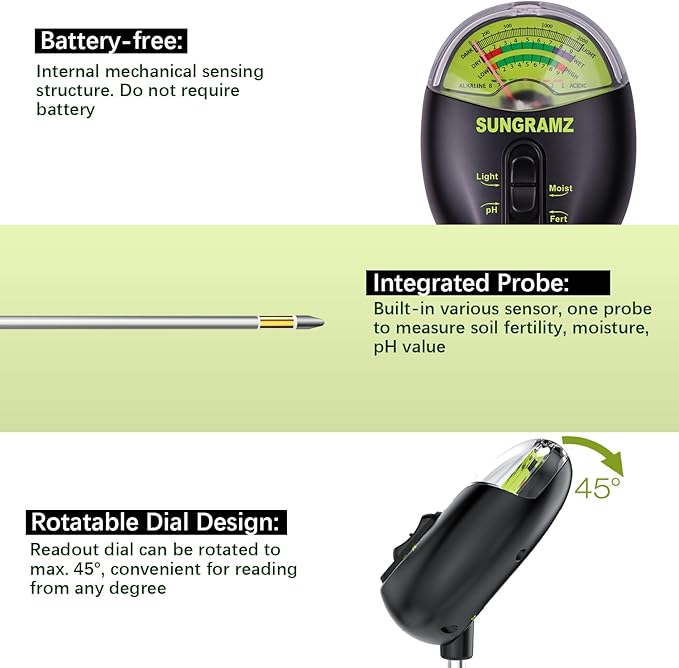 - All-in-One Soil Monitoring Tool: Designed to test soil moisture, pH level, sunlight intensity and nutrient content, this soil pH tester helps optimize plant health by giving you clear insights into soil conditions for smart, streamlined use