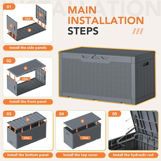 - Waterproof Design – Made from PP resin with a tight-sealing lid, this deck box protects your belongings from rain, snow, and moisture, ensuring long-lasting use in all seasons