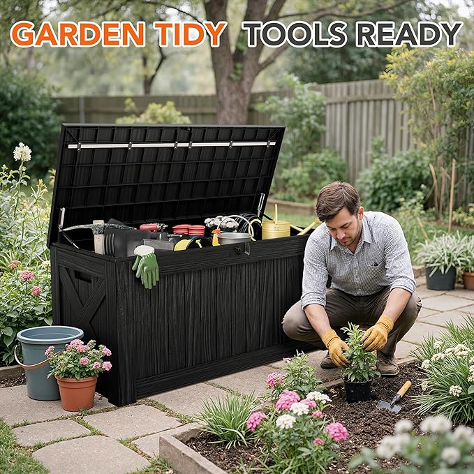 - Waterproof Design – Made from PP resin with a tight-sealing lid, this deck box protects your belongings from rain, snow, and moisture, ensuring long-lasting use in all seasons