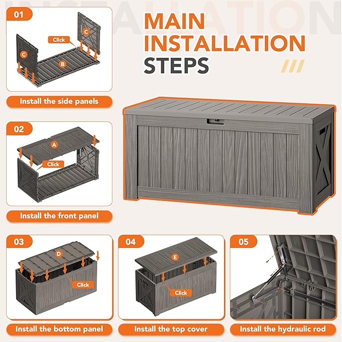 - Waterproof Design – Made from PP resin with a tight-sealing lid, this deck box protects your belongings from rain, snow, and moisture, ensuring long-lasting use in all seasons