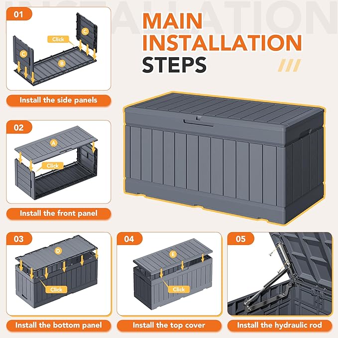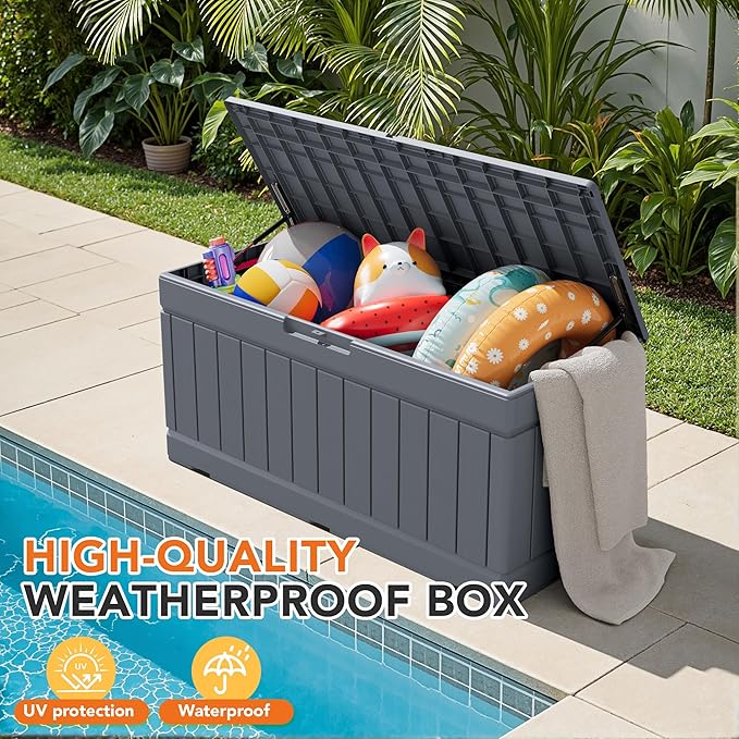 - Waterproof Design – Made from PP resin with a tight-sealing lid, this deck box protects your belongings from rain, snow, and moisture, ensuring long-lasting use in all seasons