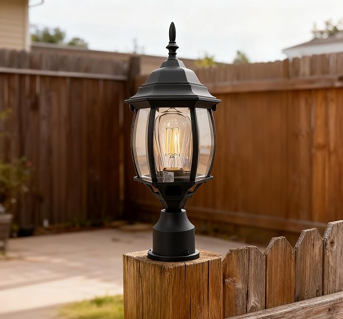 - This 17 inch black outdoor post light brings a timeless charm to your outdoor space with its classic 1900s retro design. The 17inch black lamp post light fixture features an elegant clear glass shade and hollow-curved bottom and casts enchanting and unique light shadows when illuminated. The black exterior post lantern 17” is ideal for providing accent lighting to porches, walkways, or gardens, creating a warm and inviting atmosphere.