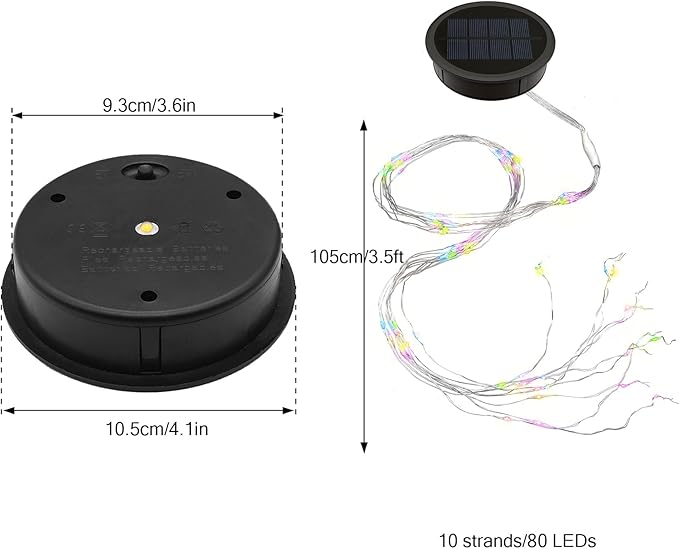 - Suitable Size: The solar lights replacement top is 4.1 inches in diameter, the bottom is 3.6 inches in diameter, comes with 10 strands 3.5 ft 80 LED flashing string lights. If your solar watering can does not work, do not bother to buy a new one, just replace the solar lamp parts.