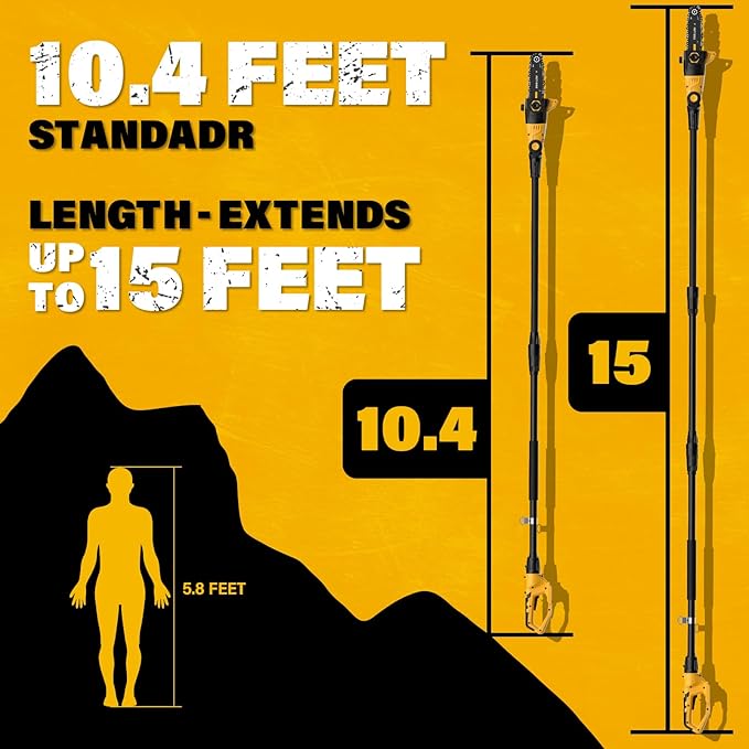 - ADJUSTABLE 15 INCH LENGTHS: The telescopic pole extends from 6.5 feet to 9.8 feet (as a pole saw) or from 5.9 feet to 9.2 feet (as a hedge trimmer). You can reach up to 15 feet (based on a 5.4-foot person lifting the pole to shoulder height).