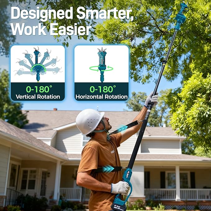 - 【Lightweight & Comfortable Design】Weighing only 2.1 lbs, this pruner includes a non-slip grip and ergonomic shoulder strap to reduce fatigue. The 180° rotating head improves reach and cutting efficiency. A protective blade cover ensures safe storage.