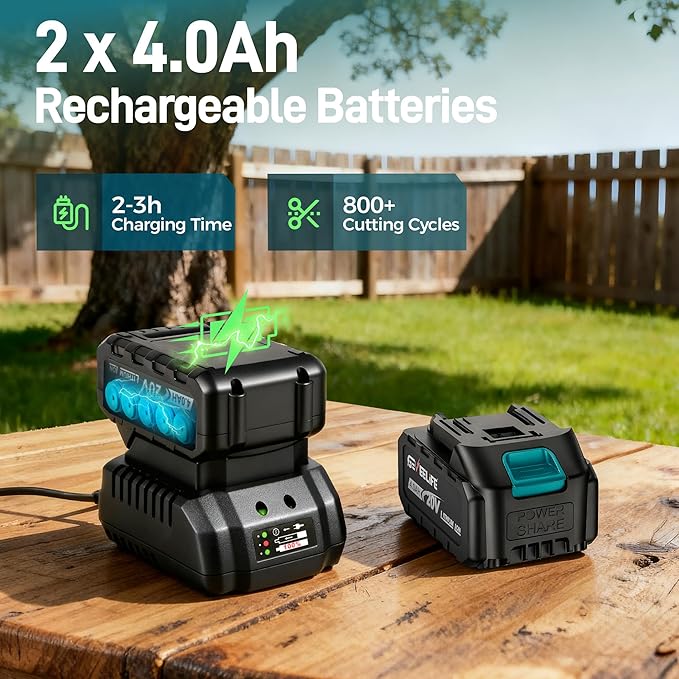 - 【Dual 4.0Ah Batteries for Longer Runtime】Comes with two 4.0Ah batteries and a fast charger for 2–3 hour full recharge. Each charge provides over 800 cuts. The built-in LCD shows battery status and cut count for easier operation.