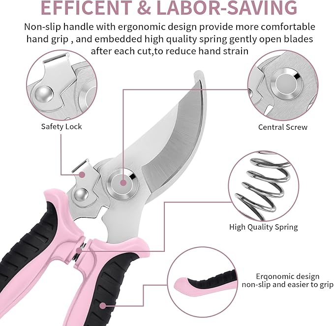 - 【SHARP CUTTING OF GARDEN SCISSORS】: This set of gardening shears is made of high quality stainless steel with good anticorrosion performance, heat treatment process, high blade hardness, more sharp and sturdy. You can easily to cut without damaging the vital stems and branches of your plants. Garden pruners is a good helper for your garden tools.
