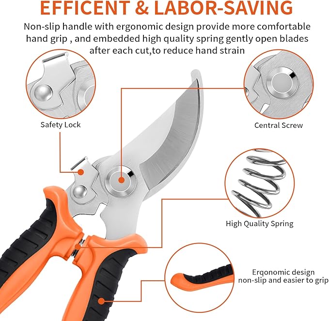 - 【User-friendly Safety Lock】: Our garden shears have a safety locking mechanism to keep the sharp blades securely closed when not in use. After use the garden clippers, just close tightly and push on the latch, which can effectively reduce accidental injuries. This is a wonderful design of gardening supplies.