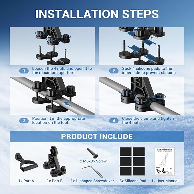 - UNIVERSAL FIT & EASY INSTALLATION: Fits most round handles (Ø0.9"–1.25"). Just loosen the screws, position the clamp where you want it on the handle, and tighten to secure. One extension handle attachment work for snow shovels, ice scrapers, rakes, metal detectors, lawn mowers, and more—improving control, efficiency, and comfort across all your outdoor chores.