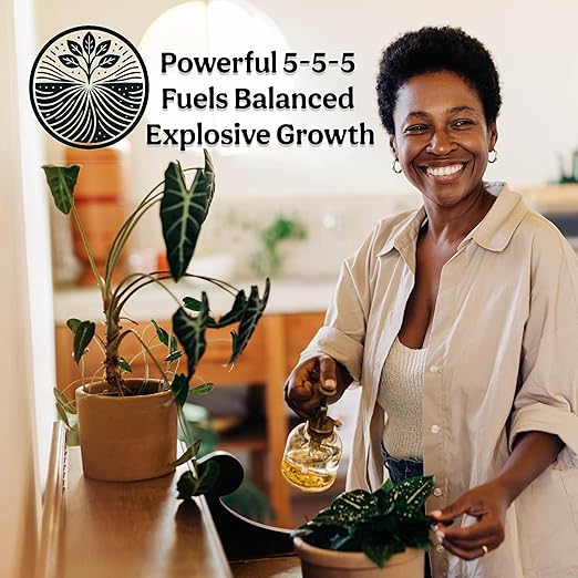 - STRONGEST 5-5-5 ORGANIC LIQUID FERTILIZER – The only true 5-5-5 organic indoor plant fertilizer and plant food. Professional-grade yet gentle; feeds instantly without burn for fast growth, greener leaves, and strong roots in houseplants, tropicals, and potted plants; ideal daily indoor use. Boosts nutrients and vigor with balanced NPK. 16oz Treats 110 Gallons