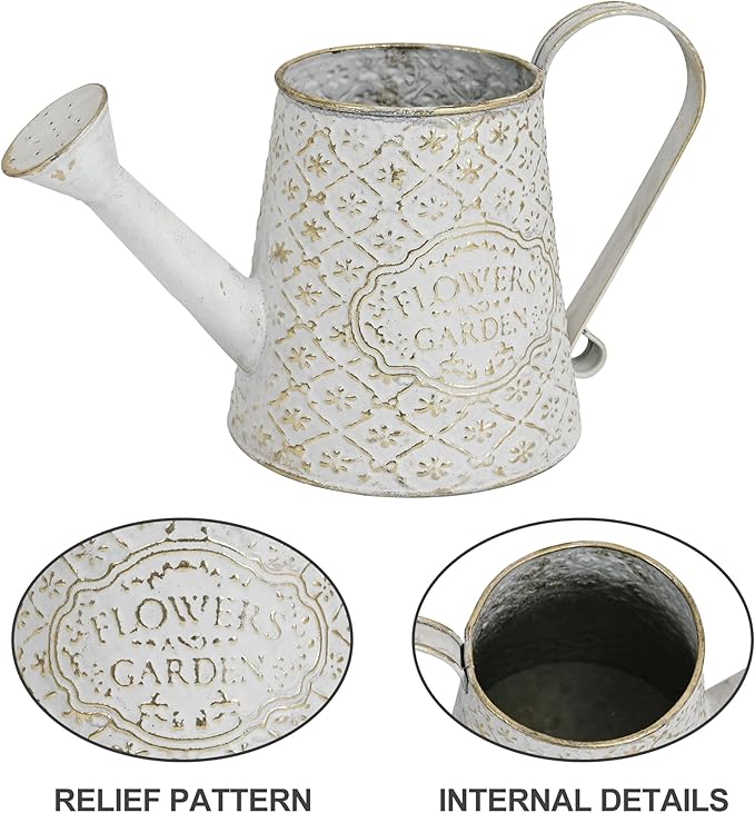 - 【CHARMING VINTAGE DESIGN】 This watering can features a nostalgic, old - fashioned look with intricate embossed patterns all over its body. The "FLOWER & GARDEN" text prominently displayed adds to its rustic and classic appeal, making it a delightful addition to any garden or home decor.
