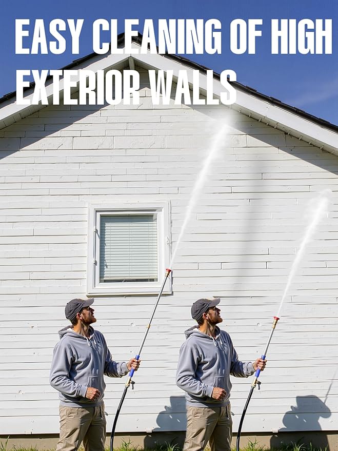 - Adjustable Length: The garden hose nozzle extends from 18 inches to 33 inches, offering flexibility for various cleaning tasks. The power washer extension wand can be adjusted without disassembly, making it easy to reach high walls, windows, or low corners, ensuring a thorough clean with no hard-to-reach areas.