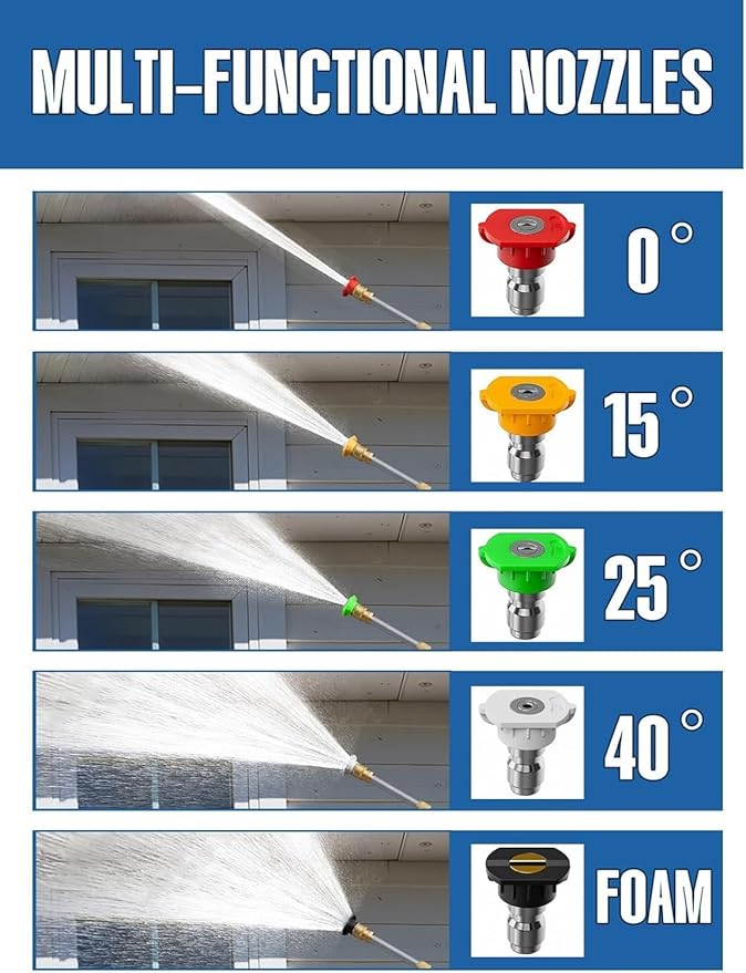 - Multi-Functional Nozzles: Equipped with 5 interchangeable nozzles for diverse cleaning needs—0° (focused jet for moss/dirt in cracks), 15° (patios/driveways), 25° (cars/garden furniture), 40° (gentle spray for plants/delicate surfaces), and 65° (broad diffused spray for large-area rinsing).
