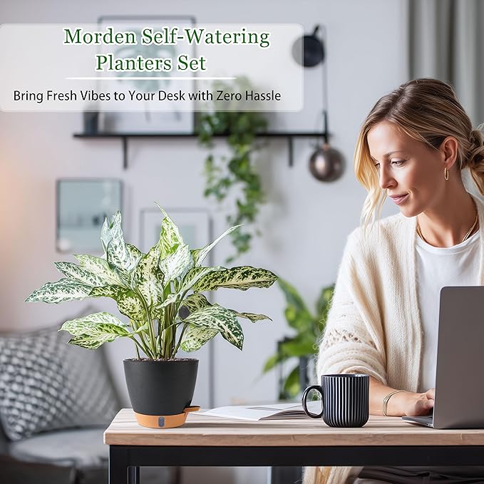 - 🌿【Complete 5-Size Self-Watering Planter Set】 This versatile set includes five self watering pots in the most useful sizes: 10, 9, 8, 7, and 6.5-inch. The intelligent self-watering system uses cotton wicks to draw water from the tray, keeping your soil perfectly moist for up to 2 weeks. Ideal as pots for plants indoor or outdoor plant pots, it's the ultimate solution for busy plant lovers and vacation care.