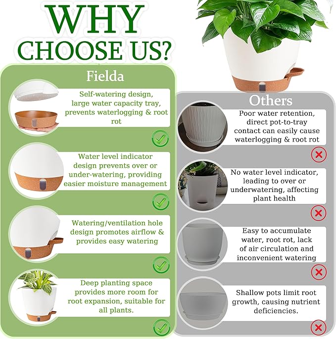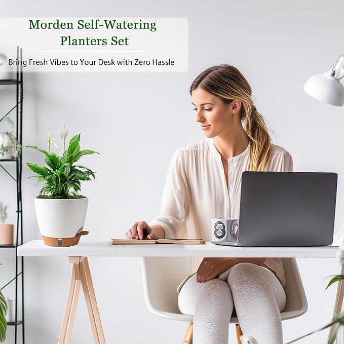 - 🌿【Complete 5-Size Self-Watering Planter Set】 This versatile set includes five self watering pots in the most useful sizes: 10, 9, 8, 7, and 6.5-inch. The intelligent self-watering system uses cotton wicks to draw water from the tray, keeping your soil perfectly moist for up to 2 weeks. Ideal as pots for plants indoor or outdoor plant pots, it's the ultimate solution for busy plant lovers and vacation care.