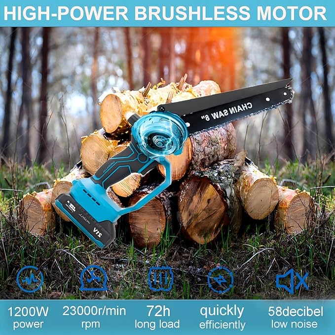 - ☘️【8‑inch Mini Chainsaw】This battery‑powered chain saw features a durable high‑carbon steel chain and automatic lubrication to minimize wear. Includes a tool‑free chain tension knob and battery indicator. The powerful combination of the sharp chain and brushless motor easily handles a variety of challenging cutting tasks, cutting wood up to 8 inches in diameter as easily as buttering, significantly reducing the time and effort required for trimming. Furthermore, it features a safety lock button; simply press the safety button and power switch simultaneously to start.