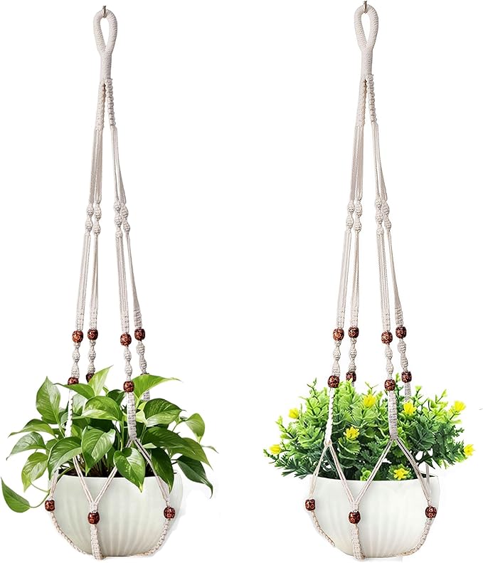 35 Inch Macrame Plant Hanger, Hanging Planter Basket with Wood Beads, Decorative Flower Pot Holder for Indoor Outdoor Boho Home Decor, Set of 2 (Ivory)