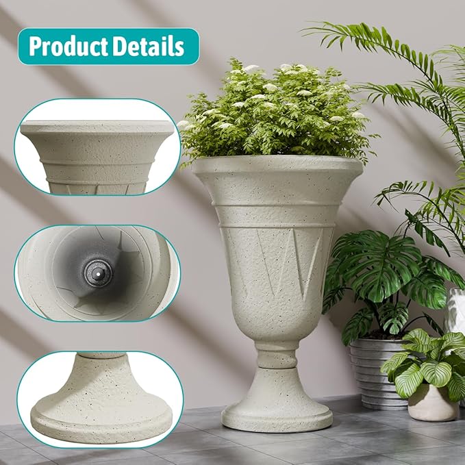 Tall Plastic Urn Planters for Outdoor Plants Set of 2-23.6" H Classic Trophy Design Indoor Large Flower Pots with Drainage Holes, Outdoor Planters for Porch Decor/Garden Vase, Off-White
