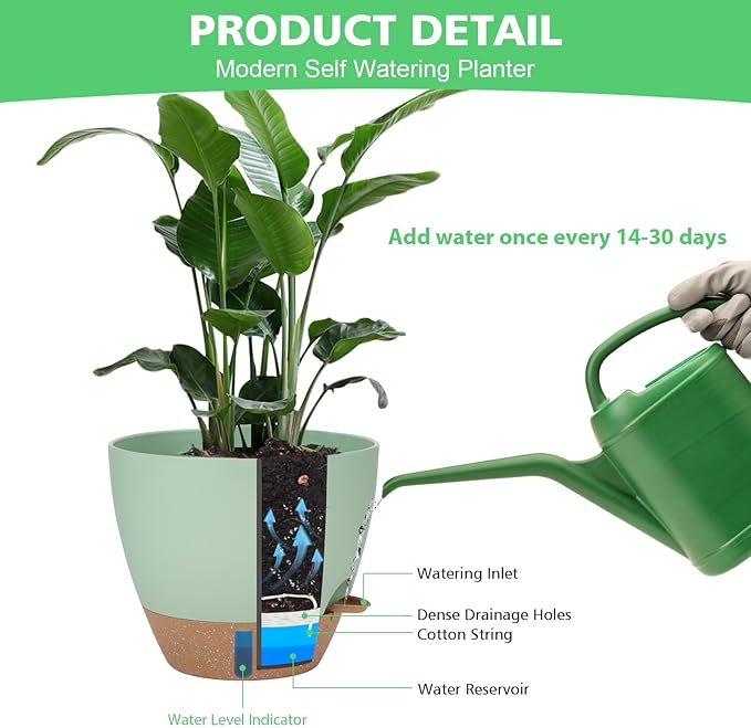 - 【SELF WATERING RESERVOIR】- Plant pots with water level window, absorbent cotton rope and removable deep reservoir, monitor the water capacity at a glance, plants auto feeder water for 7-30 days.