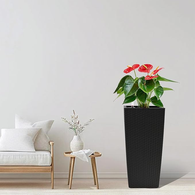 2 Pack Tall Planters for Indoor or Outdoor Plants, Self-Watering Pots with Drain Holes, 22-Inch High Faux Rattan Design Modern Tall Square Planter Box for Porch, Patio, Backyard (Pack of 2, Black)