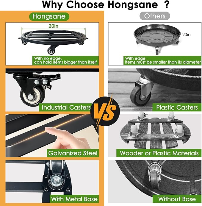 - IMPRESSIVE 550LBS WEIGHT CAPACITY: The 20" metal plant caddy can effortlessly move your large potted plants around your patio,whether reposition a massive fiddle-leaf fig to catch the sun or shift a heavy container full of vibrant blooms to follow the sunlight.It’s also ideal for greenhouse, where you might need to transport heavy potted shrubs with ease, making your gardening tasks smoother and more efficient