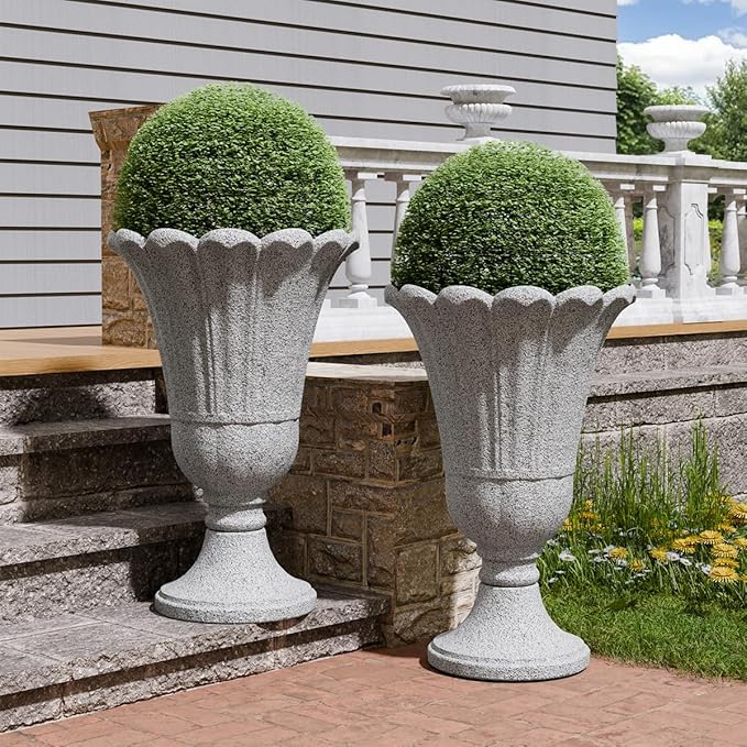 Tall Plastic Urn Planters for Outdoor Plants Set of 2-23.6" H Classic Petal Design Indoor Large Flower Pots with Drainage Holes, Outdoor Planters for Porch Decor/Garden Vase, Grey