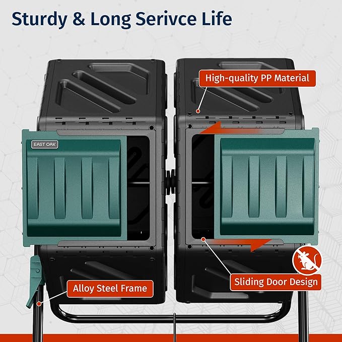 - 【360° Rotatable & Simple Assembly】No need for hand mixing or digging—this compost tumbler’s rotating design and eight-panel deep fins make turning effortless. EAST OAK includes a detailed manual and installation video for straightforward setup.