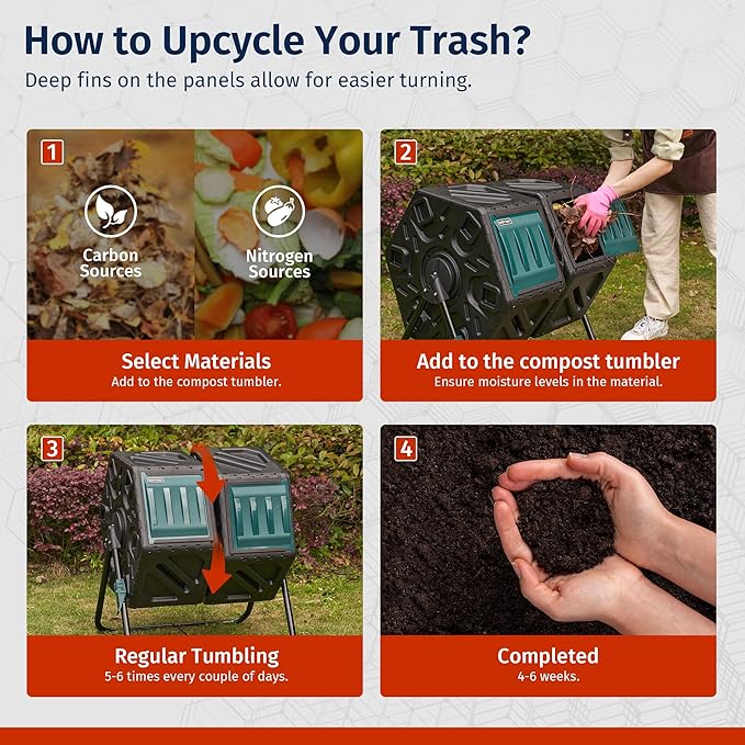 - 【Rapid Composting Cycle】Black in color, this compost container absorbs sunlight to retain heat and speed up composting. Keep the correct green/brown ratio, temperature, and humidity—there’s no unpleasant odor, and compost is ready in 4-6 weeks.