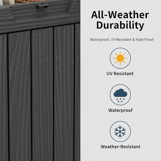 - All-Weather Durability & Low Maintenance: Crafted from heavy-duty resin with a wood grain finish, this storage box is built to resist rain, wind, UV rays, and temperature changes. It won’t fade, warp, or crack—so it stays looking new season after season with almost no maintenance.