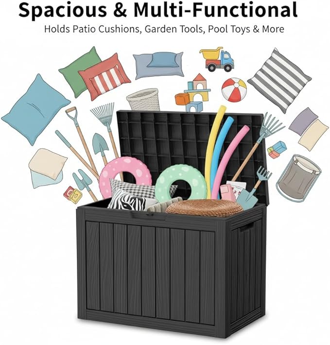 - Spacious & Multi-Functional Storage: With a generous 45-gallon capacity, this deck box effortlessly stores patio cushions, garden tools, pool toys, and outdoor gear. It also doubles as a stylish indoor organizer for laundry, toys, or household items, and can even be used as a patio seat, side table, or footrest.