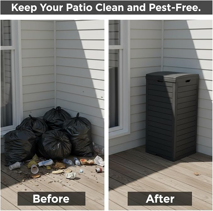 - Durable & Weather-Resistant Resin Build: Constructed from high-strength, recyclable resin, this garbage cabinet resists water, UV rays, and fading. It stays sturdy through heat, rain, and snow, without bending, cracking, or warping.