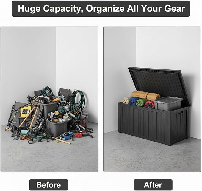 - Ample 180-Gallon Storage Capacity: Store patio cushions, garden tools, pool accessories, and outdoor gear with ease. This deck box also doubles as a versatile indoor organizer for laundry, or household items, keeping your spaces tidy and clutter-free.