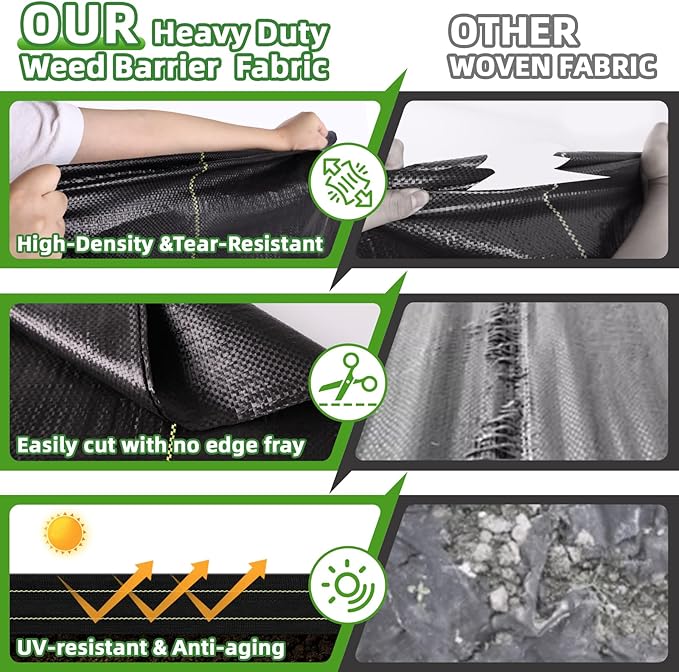 - Durable & UV Resistant: Constructed with thickened material and reinforced edges, this weed barrier fabric heavy duty resists tearing, fraying, and pressure from heavy loads or frequent foot traffic. UV-treated surface resists sun damage and aging, ensuring long-lasting outdoor performance.