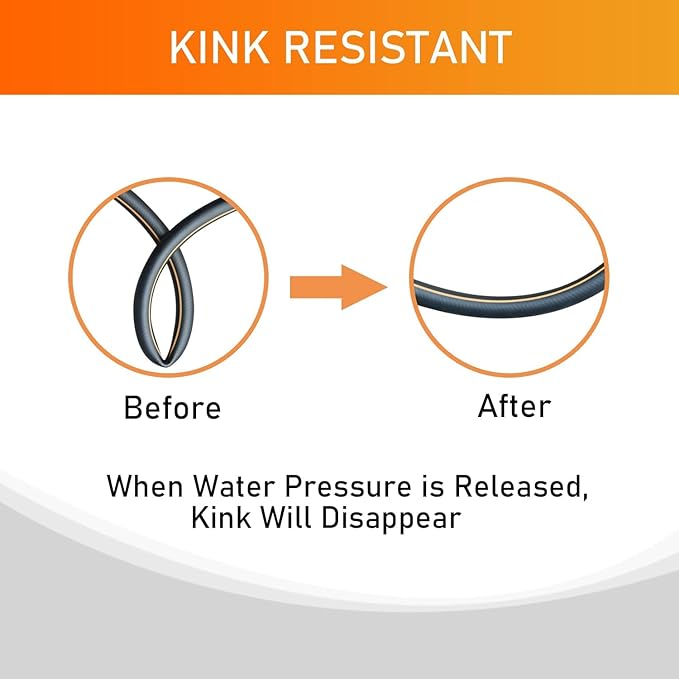 - Kink Less and Easy to Use: Just open the faucet and lay flat the hose under the normal water pressure, the kink will disappear. The special flexible material makes this waterhose easy to uncoil with no memory, it will not kink when water is full in the rubber water hose which is easy to maneuver